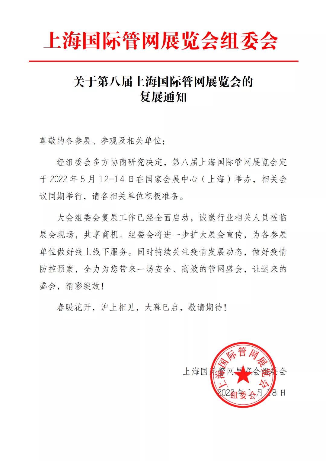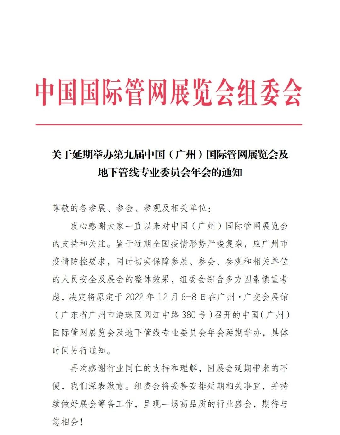 衷心感謝大家一直以來(lái)對(duì)展會(huì)的支持和關(guān)注。根據(jù)當(dāng)前疫情防控優(yōu)化形勢(shì),經(jīng)組委會(huì)研判決定:第九屆中國(guó)(廣州)國(guó)際管網(wǎng)展覽會(huì)復(fù)展檔期定于2023年3月8日-10日在廣州廣交會(huì)展館舉辦,同期舉辦2023中國(guó)國(guó)際地下管線大會(huì)暨中國(guó)測(cè)繪學(xué)會(huì)地下管線專業(yè)委員會(huì)會(huì)員代表大會(huì)。 攜手共進(jìn),共享機(jī)遇。組委會(huì)各項(xiàng)復(fù)展籌備工作已全面啟動(dòng),我們將持續(xù)加大展會(huì)宣傳與組織力度,全力以赴做好展會(huì)的各項(xiàng)服務(wù)工作,盡全力確保展會(huì)效果,為行業(yè)呈現(xiàn)一場(chǎng)高品質(zhì)、高質(zhì)量、高規(guī)格的行業(yè)盛會(huì)。我們堅(jiān)信,所有堅(jiān)持和等待都是值得的,遲到但不會(huì)缺席!…