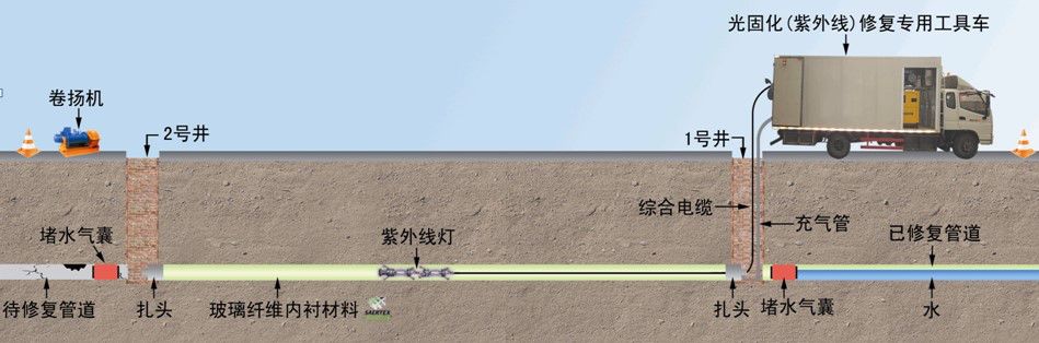 我司目前主要業(yè)務是紫外光固化管道修復,利用紫外光作為固化媒介,樹脂中含有光引發(fā)劑,經(jīng)過特定波長的紫外光照射時,樹脂產(chǎn)生固化反應,形成高強度內(nèi)襯新管,適用于管徑150mm~1600mm各種形狀的排水管道。安裝方式主要采用拉入式,采用卷揚機將充填有樹脂的玻璃纖維內(nèi)襯管拉入既有管線,通過大流量風機將內(nèi)襯管“吹”鼓,進而緊貼在既有管線內(nèi)壁上。固化后,管道能完全不依托原有管道,可以獨立承受內(nèi)壓和外壓,修復后的新管基本不會影響過水斷面,正常使用年限在50年之上。該技術(shù)對地下排水管道的修復主要采用非開挖的方式來修復,積極響應政府所倡導低碳、環(huán)保、綠色施工,嚴禁“拉鏈路”和“開膛破肚”的號召。