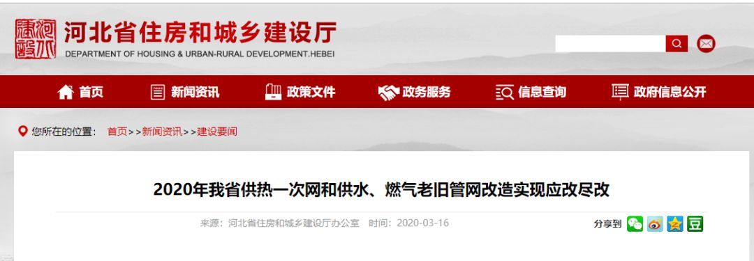 2018年,河北省啟動城市市政老舊管網改造三年行動計劃,分期分步實施市政老舊管網改造。2018-2019年,全省共完成供水老舊管網改造1182公里,供熱老舊管網改造3590.3公里(一次網508.8公里、二次網3081.5公里),燃氣老舊管網改造314.6公里,共計5086.9公里,有力提升了城市市政管網承載能力。