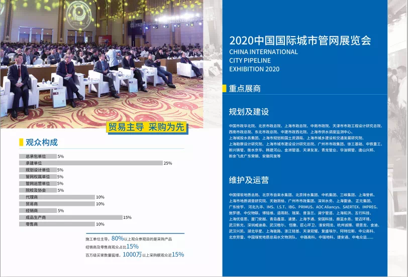 中國國際城市管網展是管網行業內重要的盛事,目前已成為未來城市管網的創新平臺。第七屆將繼續在2020年11月25-27日,于國家會展中心(上海)舉辦。展示面積將超過35000平米,屆時將吸引展商600余家,專業觀眾30000多人次。展會同期將開展40余場高峰論壇、參會代表和新品發布會議,參會代表4000余人。