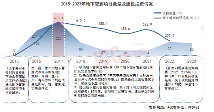 2017年,地下管廊開(kāi)工數(shù)量達(dá)最高峰,開(kāi)工項(xiàng)目數(shù)達(dá)222個(gè),投資673.4億元。2018年至2021年,雖然投資和政策力度有所減少,開(kāi)工數(shù)量穩(wěn)定,但標(biāo)準(zhǔn)和要求逐漸提升。2022至2023年,隨著《關(guān)于印發(fā)扎實(shí)穩(wěn)住經(jīng)濟(jì)一攬子政策措施的通知》出臺(tái),地下管廊開(kāi)工數(shù)再度增多,相關(guān)建材企業(yè)迎來(lái)機(jī)遇。