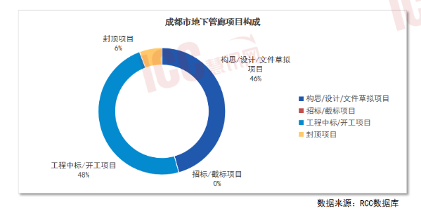 成都市在地下管廊建設(shè)方面表現(xiàn)出較高的活躍度。根據(jù)RCC數(shù)據(jù),成都地下管廊項(xiàng)目中,中標(biāo)或開(kāi)工項(xiàng)目占比48%,其次是處于構(gòu)思和設(shè)計(jì)階段的項(xiàng)目,為46%。2月,成都市科學(xué)城北路地下管廊項(xiàng)目正式竣工驗(yàn)收,長(zhǎng)770米,是西南地區(qū)最大規(guī)模的暗挖地下管廊項(xiàng)目。