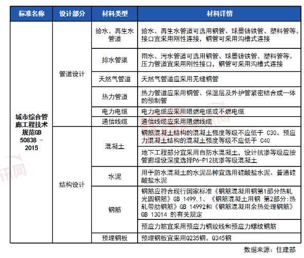 住建部數(shù)據(jù)顯示,地下綜合管廊每公里投資約1.2億元。按照此估算,2022年新建地下管廊將推動(dòng)千億市場(chǎng)。根據(jù)《城市綜合管廊工程技術(shù)規(guī)范GB 50838-2015標(biāo)準(zhǔn)》,地下管廊的建設(shè)材料分為主體建設(shè)和管道建設(shè)兩類。