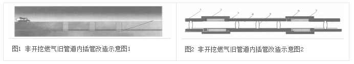 從下圖1和下圖2的施工原理圖中可知,燃氣PE管的內插入工法是基于不破壞地面結構的非開挖穿管技術、燃氣管道輸配技術、聚乙烯燃氣管的施工技術、PE材料的應用技術及地下管線探測技術為一體的綜合性施工工藝。
