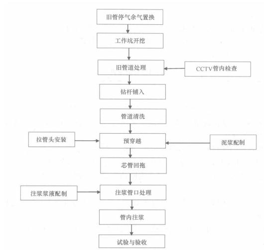 施工準備→工作坑開挖→舊管道處理→管道清洗→PE芯管回拖牽引→管內注漿→管道試驗。具體的施工流程詳見下圖。