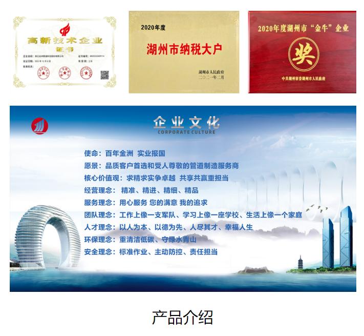 公司牢記“百年金洲、實業報國”企業使命,踐行“求精求實爭卓越、共享共贏重擔當”核心價值觀,以“精準、精進、精細、精品”為經營理念,致力于成為品質客戶首選和受人尊敬的管道制造服務商。