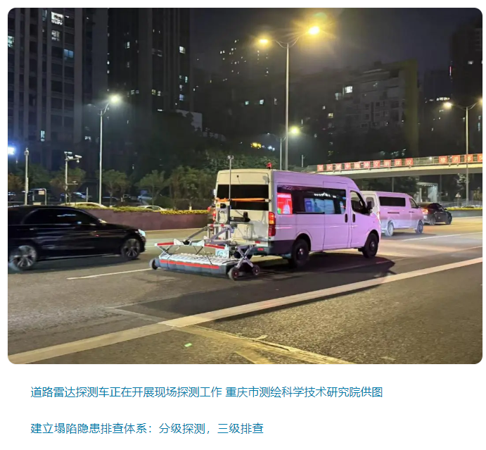 暴雨過后,路面下是否暗藏著塌陷隱患?近日,在重慶市大渡口區福溪大道,一輛形似四輪機器人的道路雷達探測車緩緩駛過,以每小時15~20千米的速度“透視”路面——這是重慶市測繪科學技術研究院技術人員開展雨后搶險探測的一幕。“快速篩查道路隱患,才能有力守護行人和車輛安全?!敝貞c市測繪科學技術研究院相關負責人介紹,針對城市道路塌陷治理難題,該院從道路塌陷成因分析與事故處置入手,研究了道路塌陷風險排查及管控技術路線,再依托實景三維重慶建設成果與自主研發的集景平臺,構建了重慶道路塌陷隱患智慧管控應用,形成了道路塌陷“探測—評估—管理—處置”全鏈條防控體系,推動道路安全防護從被動處置向主動防控轉變,為城市道路安全筑起科技防線。