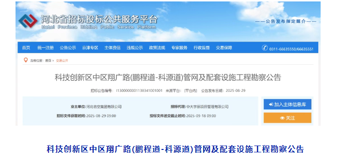 本招標項目科技創新區中區翔廣路(鵬程道-科源道)管網及配套設施工程勘察已由北京大興國際機場臨空經濟區(廊坊)公共服務局以關于科技創新區中區翔廣路(鵬程道-科源道)管網及配套設施工程初步設計的批復文件,廊臨公服初設審【2025】10號批準建設,項目業主為河北臨空集團有限公司 ,建設資金來自由北京大興國際機場臨空經濟區(廊坊)管理委員會及河北臨空集團有限公司統籌安排 ,出資比例為自籌資金占比100% ,招標人為河北臨空集團有限公司。項目已具備招標條件,現對該項目進行公開招標。